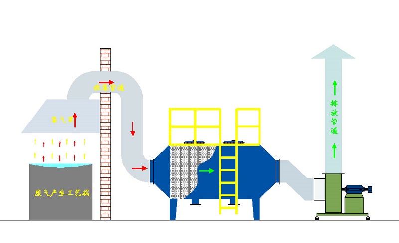 车间含有有机气体或颗粒物经集气罩收集,管道输送有机气体进入活性炭塔,有机气体进入塔内时,风速顺间降下,气体内含的较大颗粒杂物便自然沉降入塔底部,而溶入气体内的有机气体部分随气体流向流进活性炭过滤层,有机气体进入炭层时,有机气体被活性炭吸附进炭内,而干尽的空气穿过炭层进入出气仓,气体经过机械自吸后排入大气中.而活性炭层的在吸附过程中,炭会有个饱和的时间段,其活性炭饱和的过程长短与气体本身内部所含气体的浓度和工作的时间长短有直接相关。