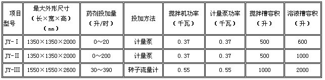 JY加药装置三种型号,都有三大部分组成:搅拌机、溶液槽、计量投加装置设备。