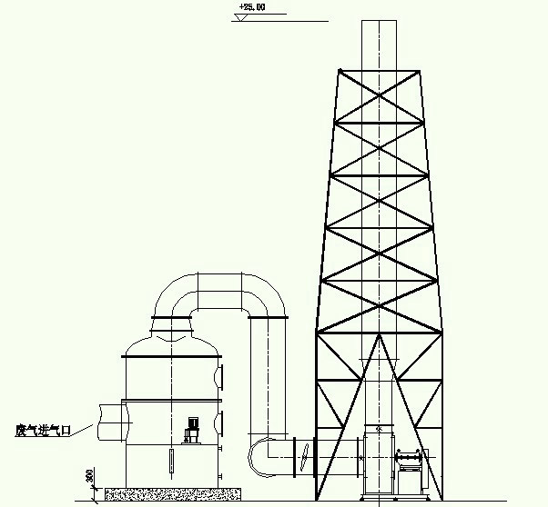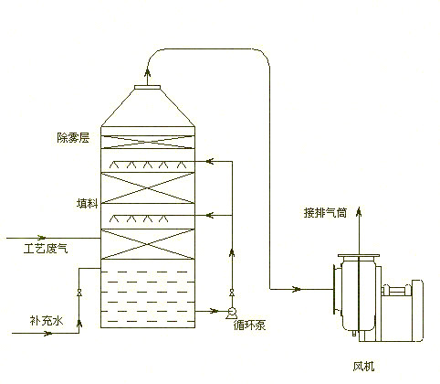 气体由离心通风机压入或吸入进风段,废气通过气液逆流的方式向上流动,至填料层,与喷咀喷出的中和液接触反应。中和反应后的废气继续向上流动至除雾层除雾及水液净化达标后经排风管排入大气中,根据废气各项指标,还可以增加填料层及喷淋装置,可使废气净化更彻底和处理更高浓度的酸雾气体。