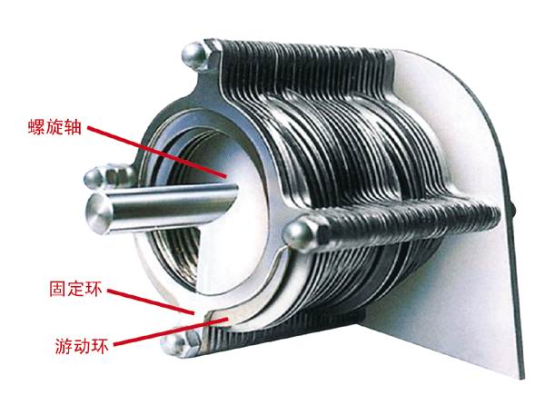 由固定环,游动环相互层叠,螺旋轴贯穿其中形成的过滤主体。通过重力浓缩以及污泥在推进过程中受到背压板形成的内压作用实现充分脱水,滤液从固定环和活动环所形成的滤缝排出,泥饼从脱水部的末端排出。