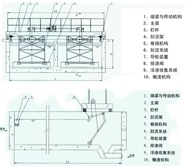 桥式刮泥机采用桁架式结构,当刮泥机不工作时,即停在进水端;当刮泥机工作时,顺水流行驶时,先放下撇渣板,将池面浮渣向池端钢制撇渣槽内,而刮泥板被提离池底;反向行驶时,放下刮泥板,将池底污泥刮向池端集泥槽内,而撇渣板被提起,离开液面,以防浮渣逆行;依此作往返工作运动,从而达到刮泥、撇渣的目的。设备主要特点